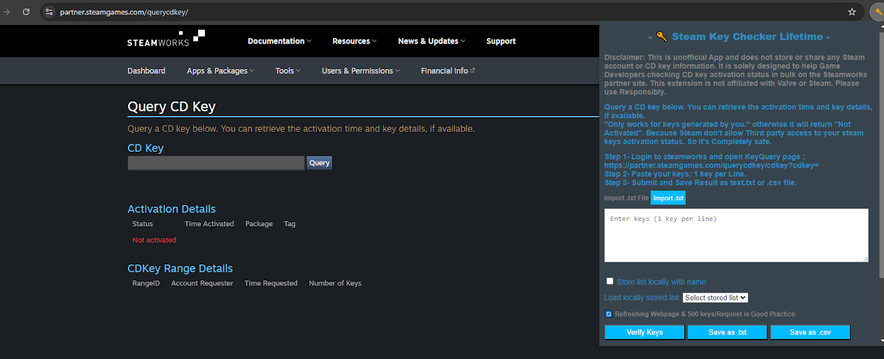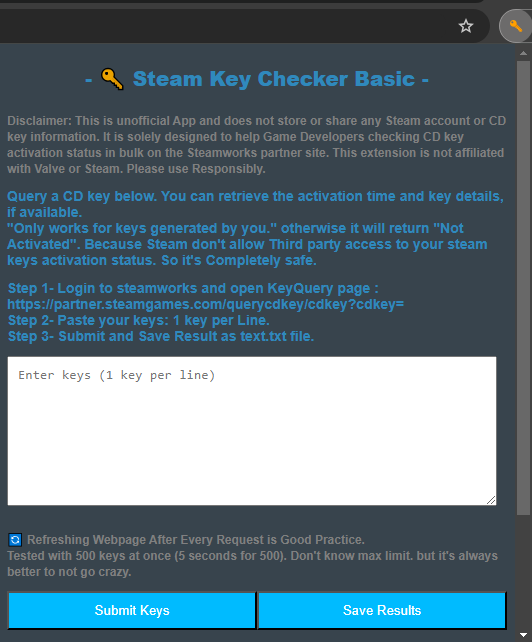 This Tool Only works for Steamworks Game Developer/Publishers/Partners to verify own game keys. Simply βOnly works for keys generated by you.β